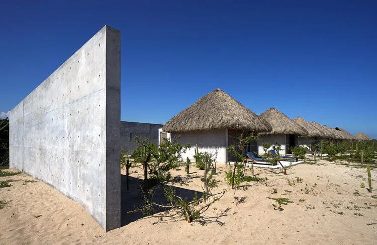 安藤忠雄的建筑,是侘寂理念的現代化延伸。墨西哥太平洋沿岸的 Casa Wabi 項目,是一個典型案例。裸露的混凝土墻面保留了施工痕跡與細微裂紋,木材和石材自然搭配。陽光透過天窗傾瀉在墻面和地板上,裂紋、凹凸和紋理在光影中緩緩流動。